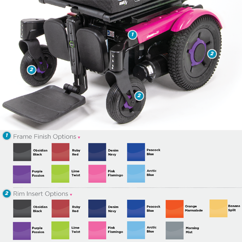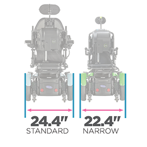 •Front casters are moved outboard to allow use of a center mount front rigging to help improve the comfort of the user. The center mount front rigging can tuck under up to 7˚