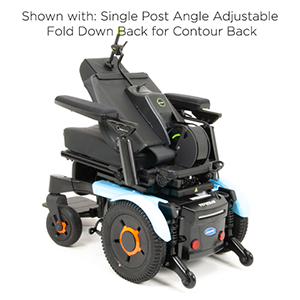 •Front casters are moved outboard to allow use of a center mount front rigging to help improve the comfort of the user. The center mount front rigging can tuck under up to 7˚