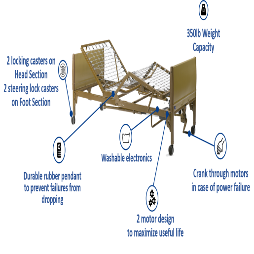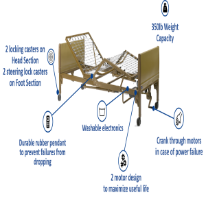 US made Invacare 5310IVC bed featrues Interchangeable head and footboards make delivery and set-up easy and reduce inventory complexity while simple, color-coded electronic connections take the guesswork out of servicing. Electronics can be washed with standard water pressure.