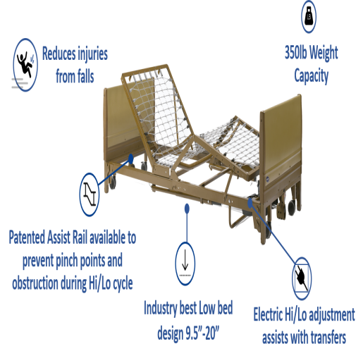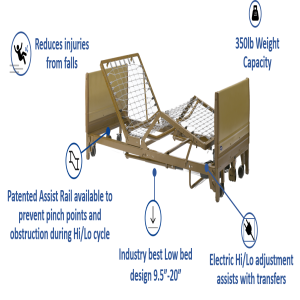 BED38LOW-1633 Full-Electric Low Bed Package includes 5410LOW Full-Electric Low Bed, 6632 Assist Rails and 5185 Homecare Innerspring Mattress 36" x 80"