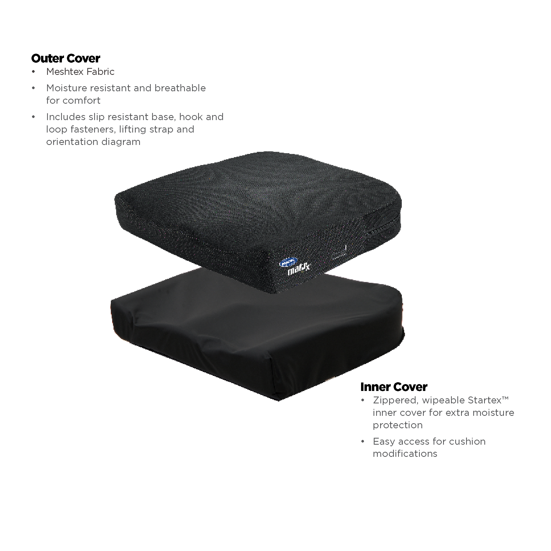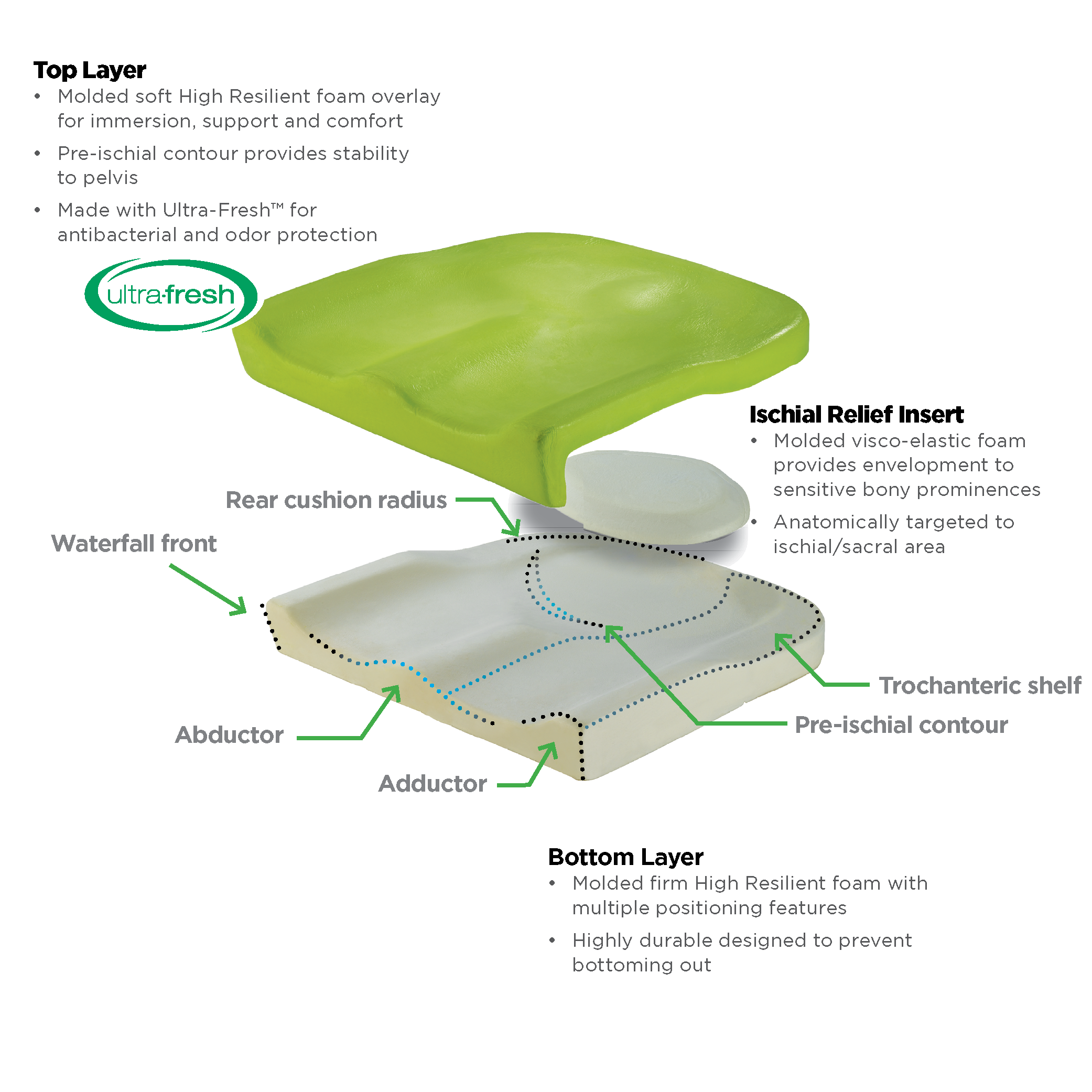 The Matrx Vi Cushion is anatomically designed with dual-density, HR foam layers and includes a Visco-elastic foam insert, pre-ischial contour, trochanteric shelf and beveled front-end.